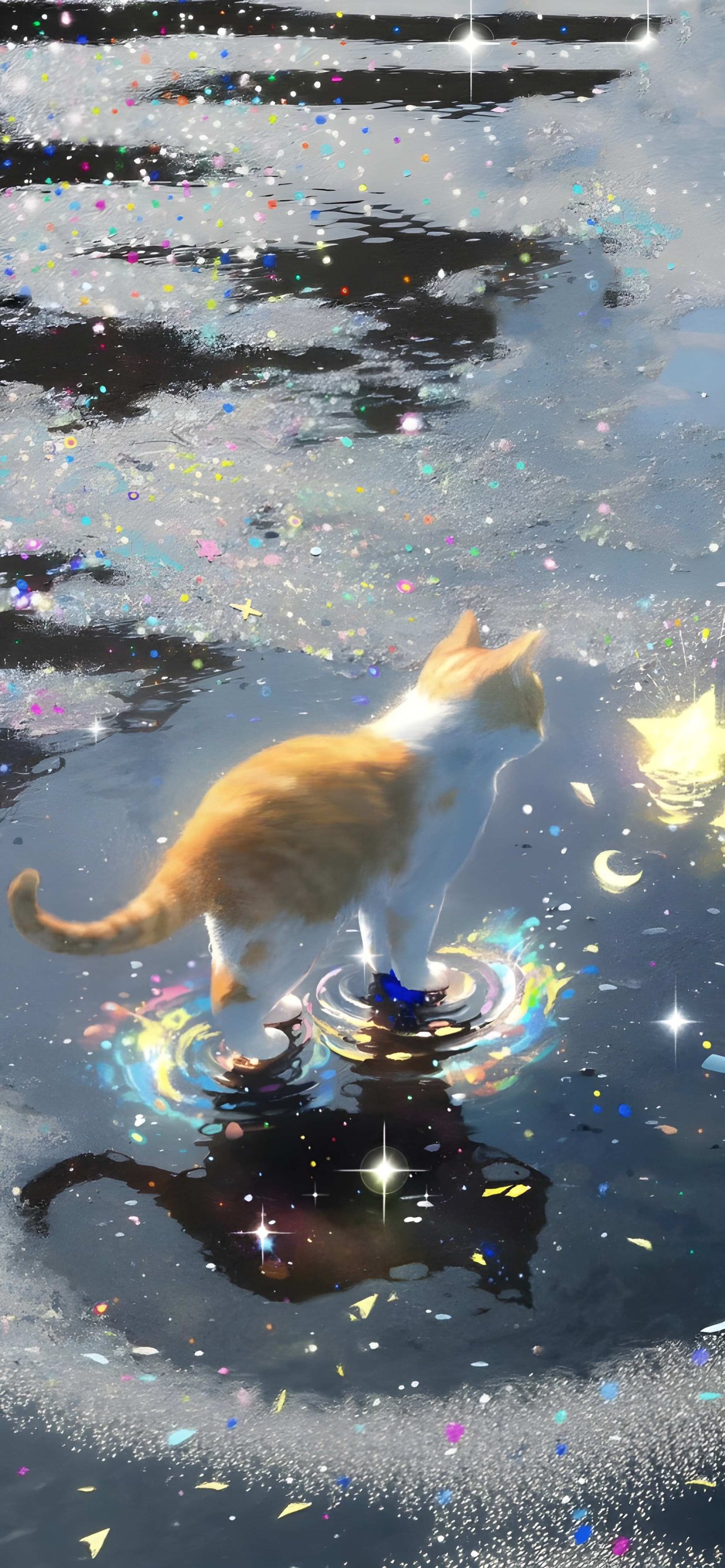 This beautiful animal-themed wallpaper captures an orange cat standing gracefully in a puddle with rainbow-colored ripples and sparkling confetti-like stars. With its warm golden tones blended with iridescent hues and a whimsical, dreamy mood, it brings a sense of wonder and playfulness to your screen. Perfect for cat lovers, dreamers, or anyone seeking a touch of magic, it adds a layer of charm and fantasy to your digital setup.