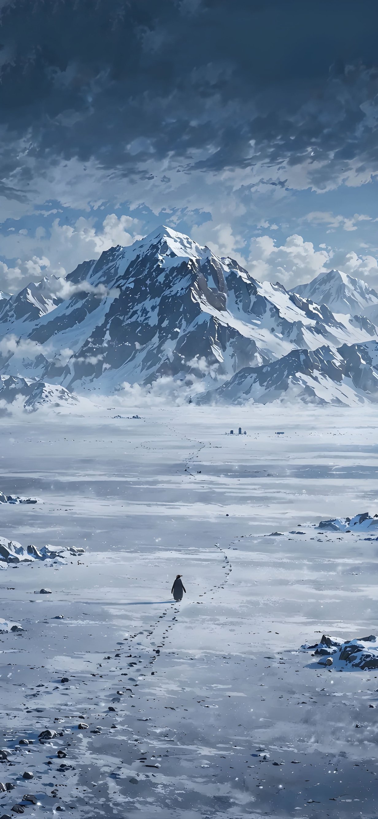 This beautiful nature wallpaper captures a lone penguin walking across the frozen Antarctic landscape, leaving delicate footprints in the snow beneath towering icy mountains. With its crisp whites, cool blues, and serene tones, it brings a sense of calm and purity to your screen. Perfect for nature lovers, wildlife enthusiasts, or anyone seeking tranquility, it adds a touch of minimalist elegance to your digital setup.