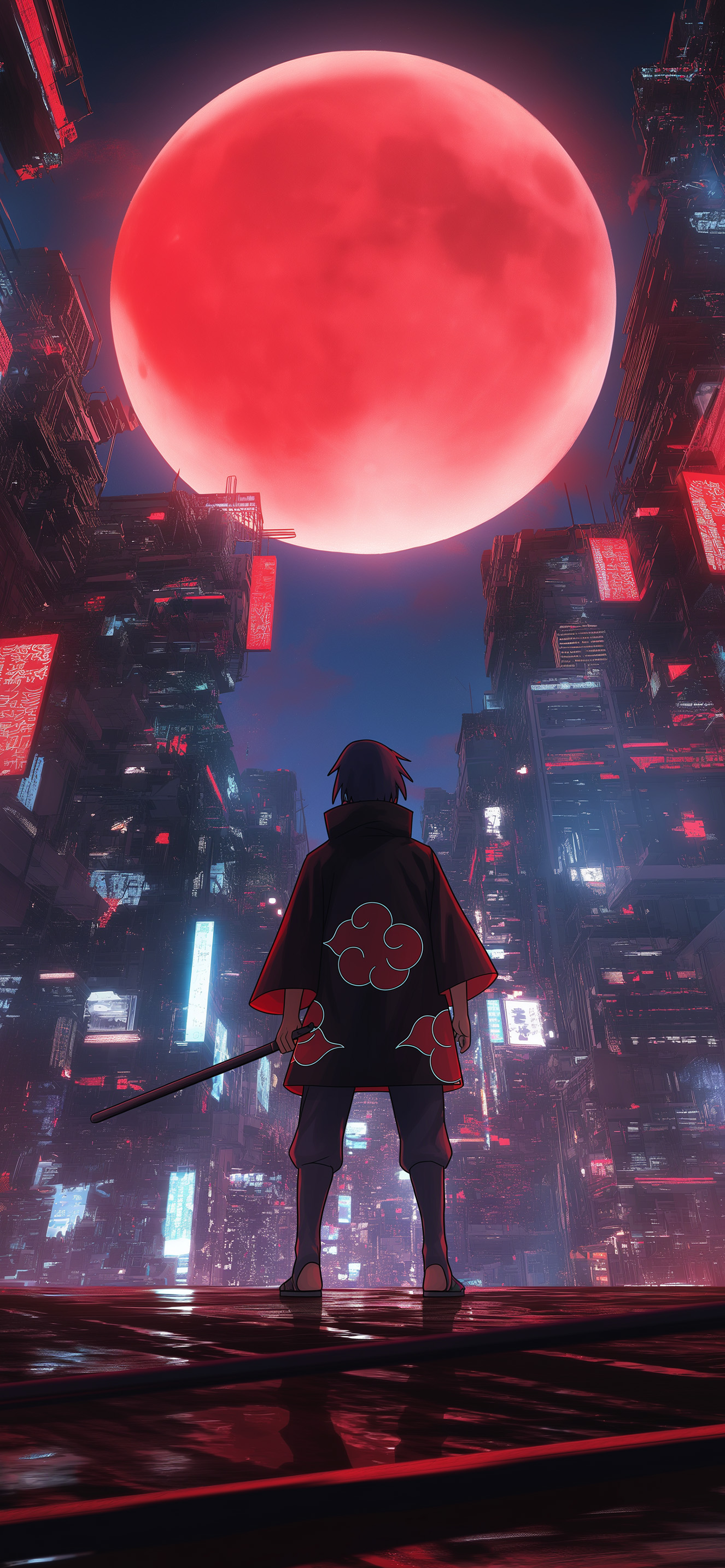 This beautiful anime cyberpunk wallpaper captures Itachi Uchiha in his Akatsuki cloak, standing beneath a glowing red moon with a futuristic neon skyline. With its deep crimson tones and moody contrast, it brings a sense of mystery and power to your screen. Perfect for Naruto fans, anime lovers, or anyone seeking a bold aesthetic, it adds a touch of dark elegance to your digital setup.